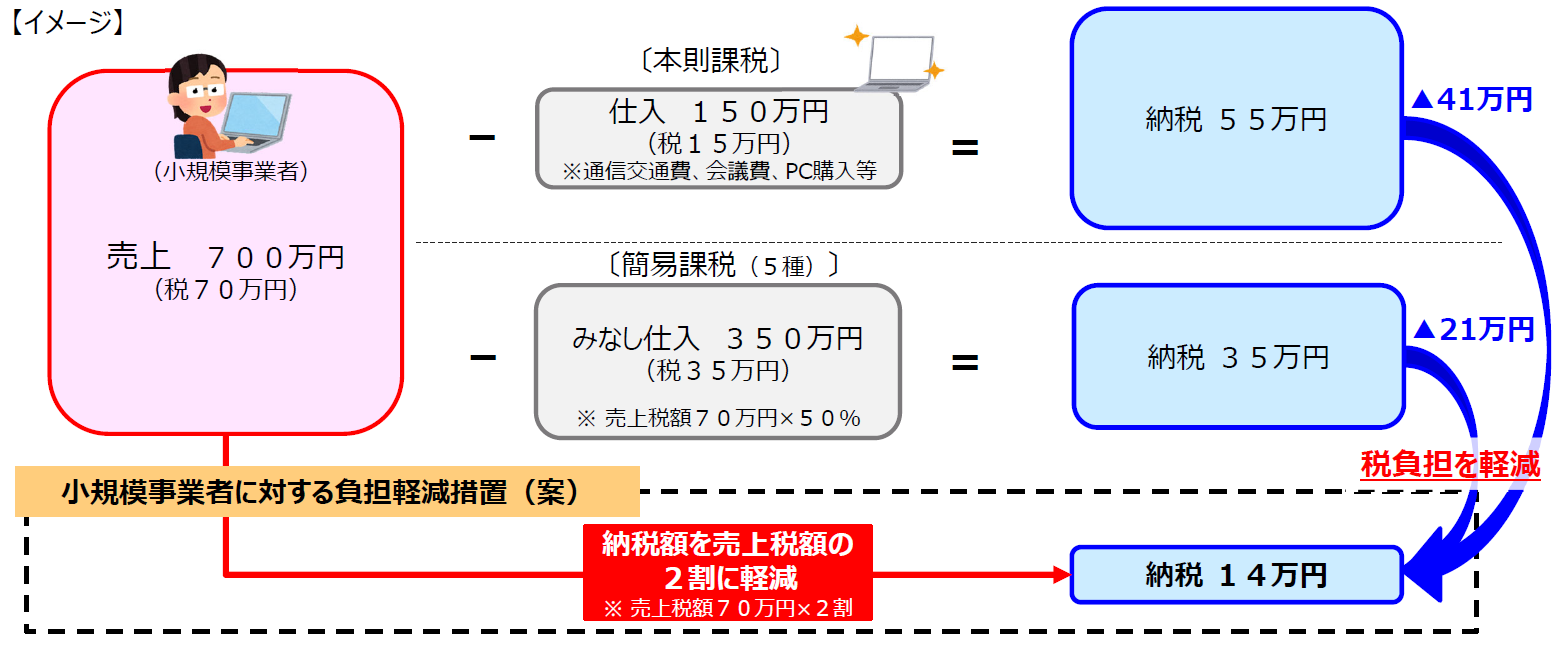 2割特例を利用すれば本則課税より41万、簡易課税より21万円、税負担を軽減できます。