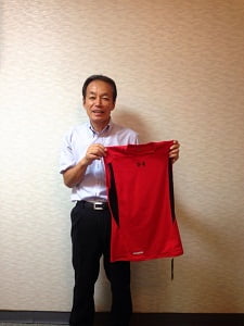職員より赤いちゃんちゃんこならぬ赤いランニングウェアをプレゼントしました。