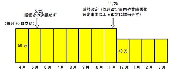 例)3月決算で毎月の役員報酬は50万円であった。5月25日の定時株主総会の際、役員報酬の改定は無かったものの、11月25日の臨時株主総会にて営業利益確保のために、12月の役員報酬から40万円に改定した場合。