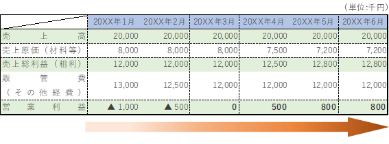 計画と聞くとハードルの高さを感じられる経営者様も多いかと思われますが、シンプルに言えば毎月の売上高から材料やその他経費を引いて赤字にならないよう段階的に売上高や経費を調整してく事前準備ととらえてもよいかもしれません。