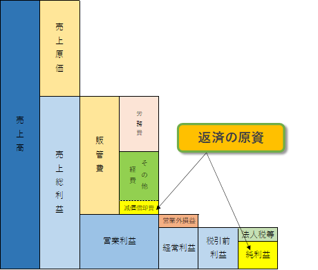 現在借りている借入金を返すためにはこの純利益がプラス、つまり黒字化させ、かつ返済の原資が年間の返済金額を超えていなければなりません。