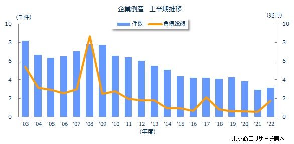 東京商工リサーチの「全国企業倒産状況」を見ると、2022年上半期の「新型コロナウイルス」関連倒産は1,121件(同36.3%増)で、同年9月は過去最多の210件発生し次第に増勢のピッチが上がってきています。