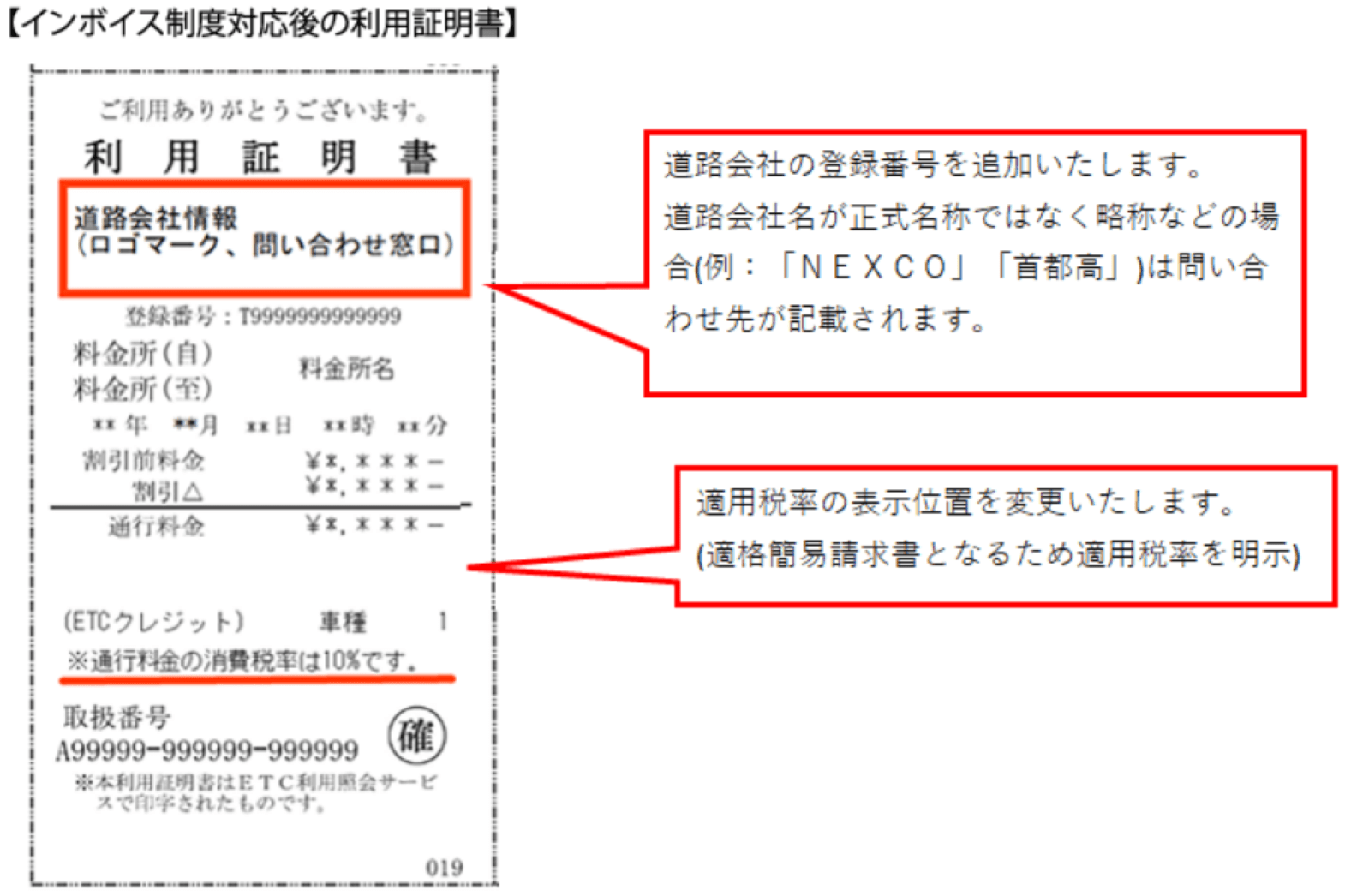 ETC利用照会サービスより発行する利用証明書は、インボイス制度開始の2023年10月1日までにインボイスの要件を満たしたレイアウトに変更予定で、以下のような書類になります。